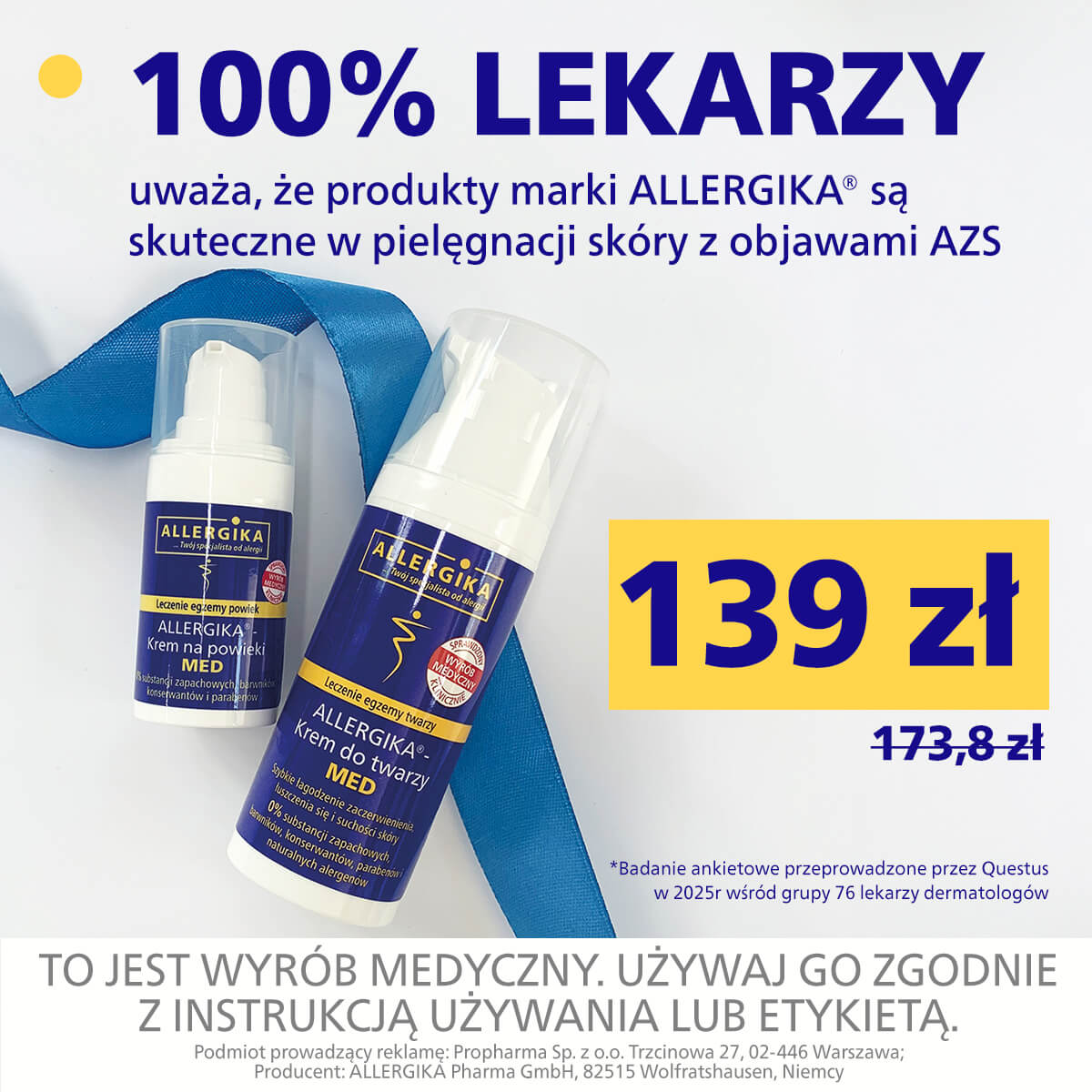 W naszej ofercie znajdziesz m.in. Krem na powieki, Krem do twarzy i Krem z olejem z wiesiołka 20% do podrażnionej skóry łokci i dłoni. Każdy z produktów został poddany badaniom klinicznym i zawiera wyłącznie niezbędne i sprawdzone składniki – w przypadku ALLERGIKA® mniej znaczy więcej!