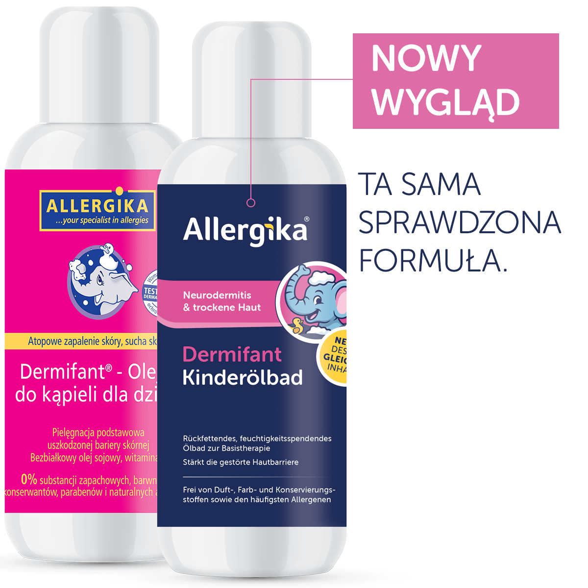 Dermifant®- Olejek do kąpieli dla dzieci to wyjątkowo delikatna emulsja do mycia i pielęgnacji skóry wrażliwej, suchej i atopowej stworzona przez markę ALLERGIKA®. Dzięki aż 95% zawartości lipidów intensywnie nawilża, chroni przed przesuszeniem i wspiera naturalną barierę skóry. Formuła oparta wyłącznie na roślinnym, bezbiałkowym oleju sojowym bogatym w kwasy tłuszczowe omega-3 i omega-6 oraz witaminę E, pozostawia skórę dziecka miękką, gładką i ukojoną po kąpieli.